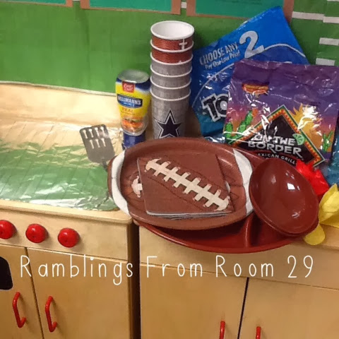 Before I opened dramatic play on Thursday as the tailgate, I asked them if they knew why someone would have a party and what kinds of things people might do and eat at a tailgate. Their answers were pretty spot on. Some children mentioned chips and dips, others mentioned various items to grill, and still other said lots of food!